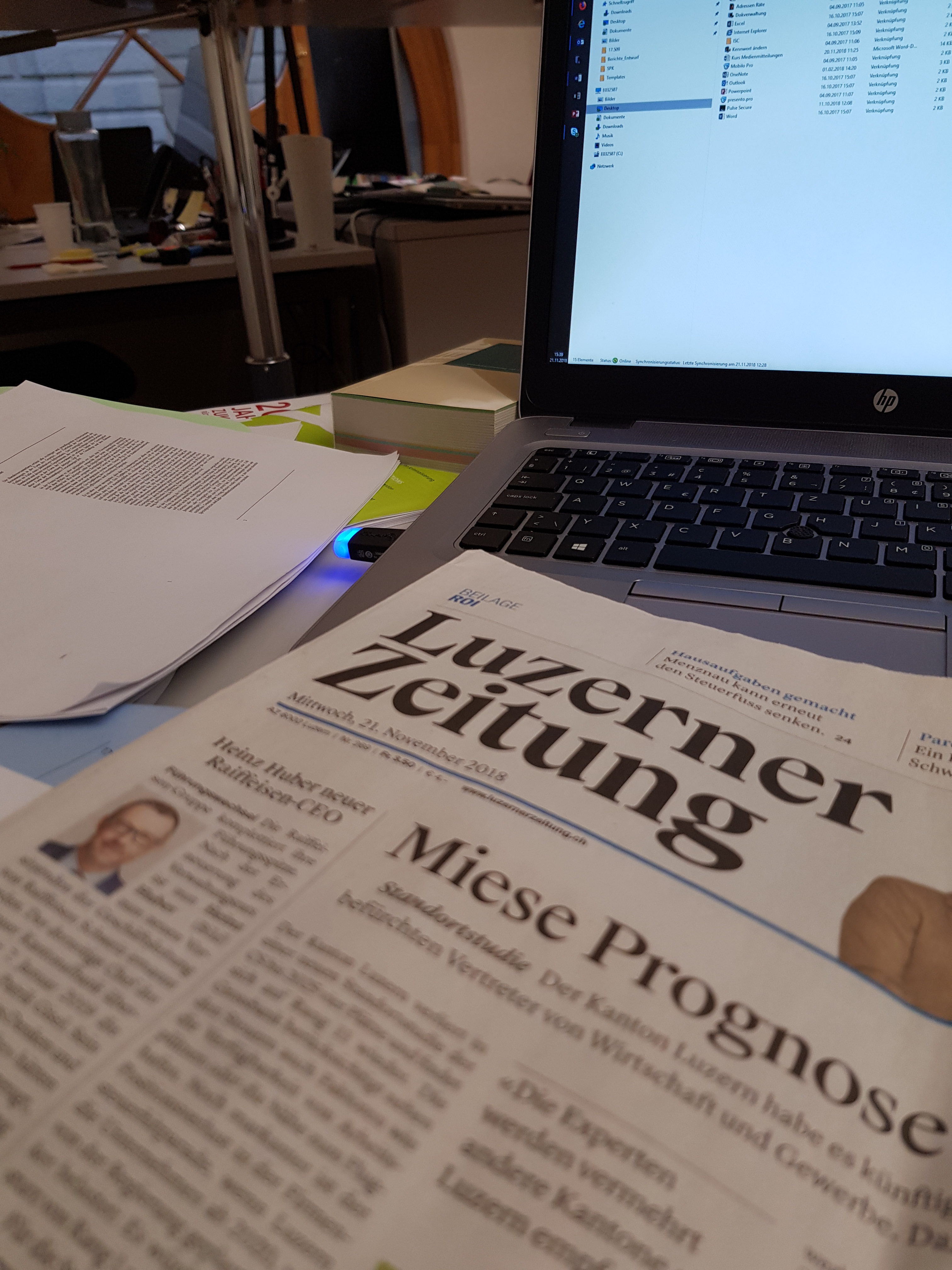 Von seiner schmucken 3-Zimmer Wohnung zum Arbeitsplatz sind es nur fünf Gehminuten. Wie jeden Morgen begrüsst er bei der Sicherheitskontrolle die Securitas. Da macht er auch an einem Samstag keine Ausnahme. Seit bekannt wurde, dass im nächsten Jahr eine neue Sicherheitsfirma den Sicherheitsdienst im Gebäude übernehmen wird, ist die Stimmung beim Sicherheitspersonal merklich gesunken. Ein fröhliches „Guete Morge“ kann daran zwar nichts ändern, bringt aber immerhin ein bisschen Aufheiterung in den Alltag. Er geht weiter zu den Postfächern und holt sich die aktuelle Ausgabe der Luzerner Zeitung. Früher las er hier jeweils noch die Obwaldner Zeitung, um immerhin einigermassen darüber informiert zu sein, was dort so vor sich geht. Im Rahmen einer Sparmassnahme wurde dieses Abonnement aber gekündigt. Seither muss er sich mit der Luzerner Zeitung begnügen.