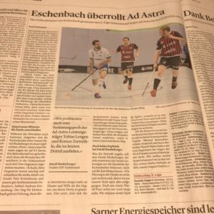 (Obwaldner Zeitung) 49:11 zeigte die Matchuhr, als der Thuner Verteidiger Janik Saurer Sarnens Britschgi zum 1:5 aus Sicht von Ad Astra überwand. Sinnbildlich für die Partie, wie der Treffer zu Stande kam: Der Thuner Rehor, der auffälligste Akteur an diesem Abend, führte einen Freistoss schnell aus und hatte das Auge für den freistehenden Kollegen, der mit einem platzierten Weitschuss traf. „Wir standen nicht nur in dieser Situation zu weit weg von unseren Gegnern. Allgemein waren wir heute nicht so auf der Höhe, wie dies notwendig gewesen wäre“, wusste Sarnens Verteidiger Valerio Läubli um das Manko in den eigenen Reihen. Damit war der Mist geführt in dieser Partie, obwohl Marco Schöni kurz darauf nochmals auf 5:2 verkürzen konnte. Die Sarner waren jedoch offensiv zu ideenlos an diesem Abend, als dass die Thuner ums Weiterkommen zittern mussten. Im Gegenteil: Beim Versuch ohne Torhüter und mit sechs Feldspielern nochmals zu etwas Zählbarem zu kommen, traf das Heimteam noch zwei Mal ins verwaiste Tor zum 2:7-Schlussresultat.